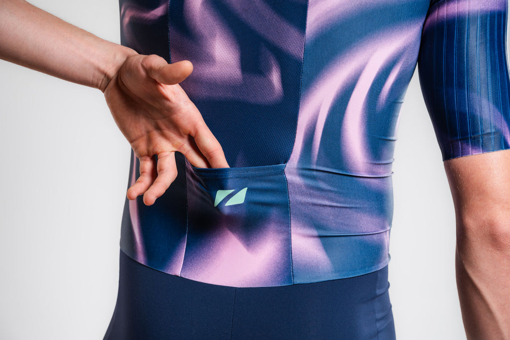 Recycelte Komponenten werden auch beim Chamois und den UFO-Beinabschlüssen aus Silikon verwendet, um während des gesamten Rennens einen sicheren, bequemen Sitz zu gewährleisten. Das Tri-Lite-Polster bietet eine Polsterung mit unterschiedlicher Dicke für lang anhaltenden Sattelkomfort, während in der elastischen Rückentasche Nahrung und wichtige Dinge sicher aufbewahrt werden können. Mit kurzen Ärmeln, die zusätzlichen Sonnenschutz und Aerodynamik bieten, ist dieser Trisuit ein Gleichgewicht zwischen Stil, Nachhaltigkeit und Funktionalität.